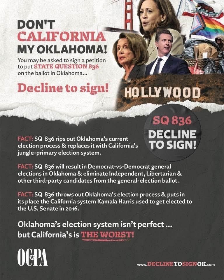 DECLINE TO SIGN – State Question 836 (attach the 2nd attachment “Don’t California My Oklahoma”)